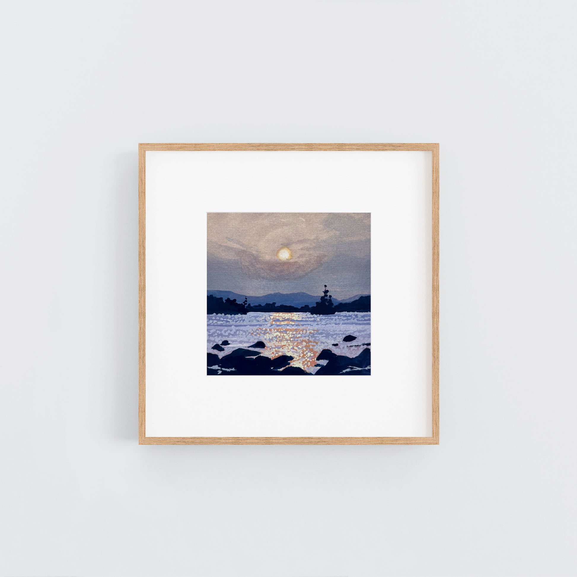 Provided with 8”x8” mat with 4.5x4.5 opening, backing board, and plastic sleeve for protection. It is recommended gouache paintings be framed behind glass to protect them.