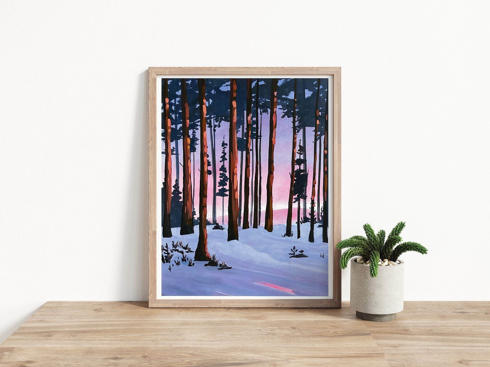 Art print reproduction of the original gouache landscape painting 'Blazing Winter Sunset'.
