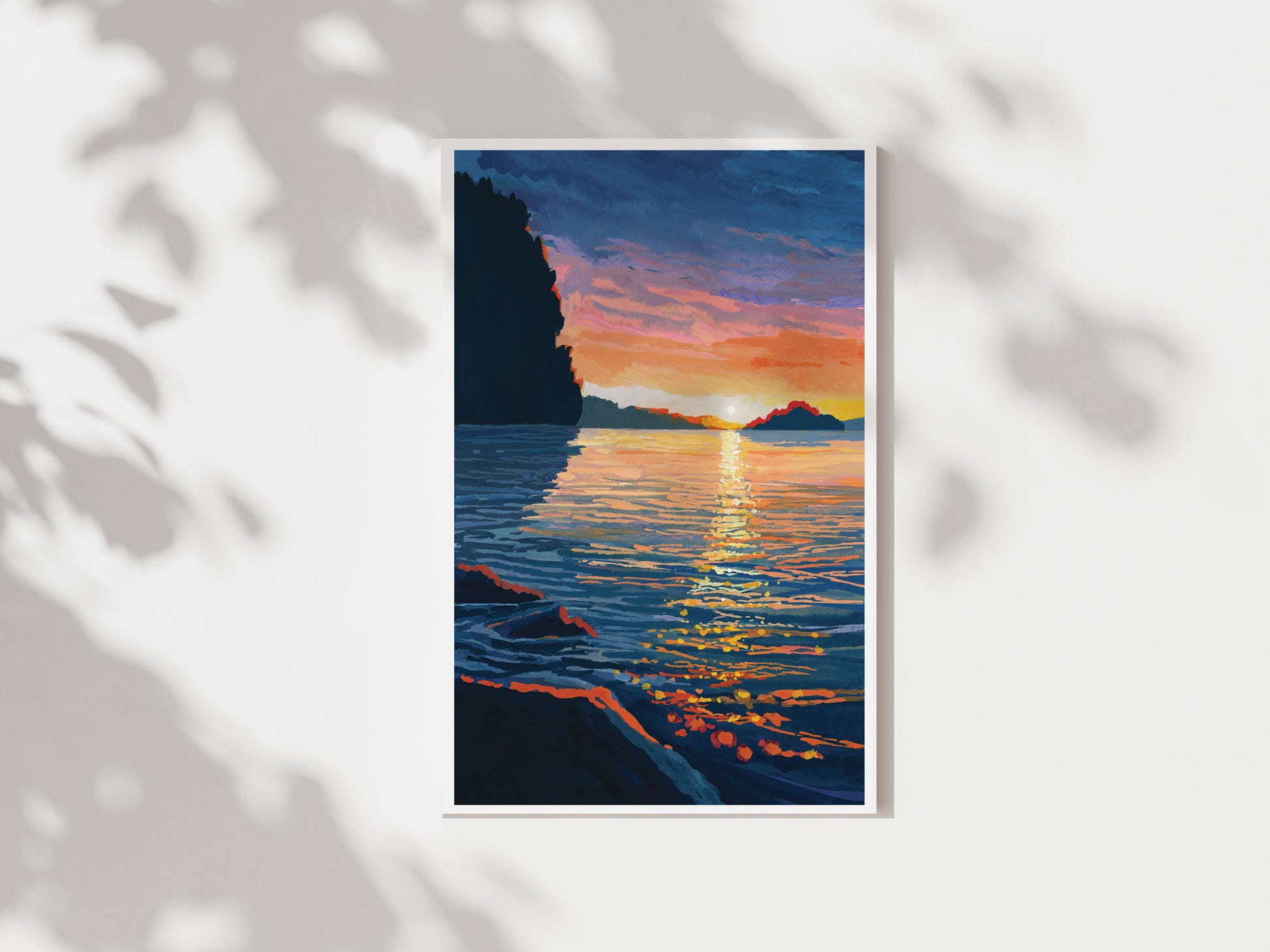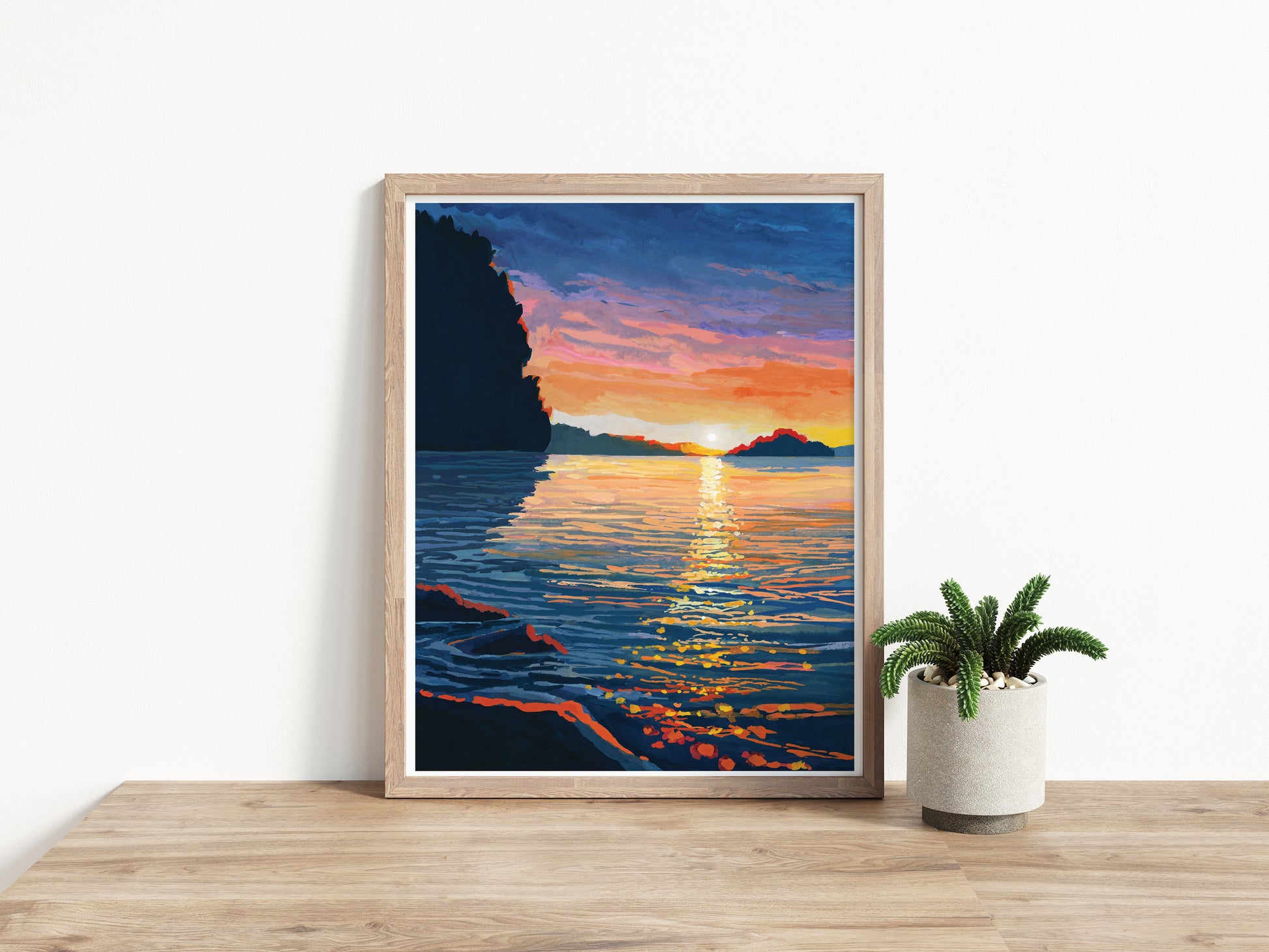 This is an art print reproduction of the original gouache landscape painting ‘Sparkling Sunset’.